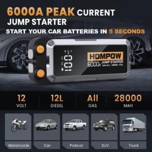 HOMPOW 6000A Jump Starter, 28000mAh 12V Car Battery Charger for All Gas and Up to 12L Diesel Engine, Portable Jump Box with LCD Screen, LED Light ,Type-C Fast Charging